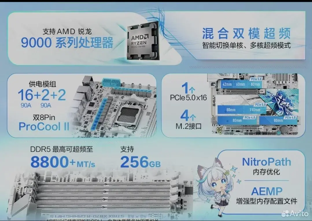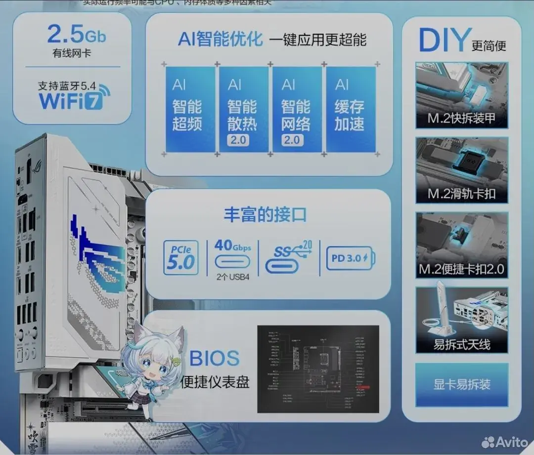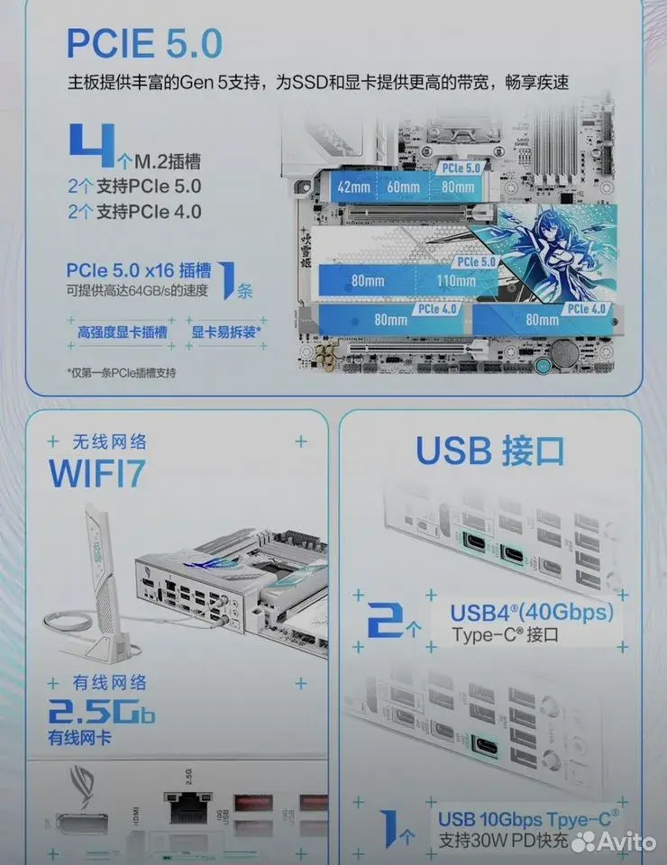 https://www.avito.ru/ussuriysk/tovary_dlya_kompyutera/asus_rog_strix_x870-a_gaming_wifi_s_7633504669?slocation=621540&context=H4sIAAAAAAAA_wE_AMD_YToyOntzOjEzOiJsb2NhbFByaW9yaXR5IjtiOjA7czoxOiJ4IjtzOjE2OiJrYlNWWkpIZjhQeVo0b29GIjt9IS7_HT8AAAA Материнская плата ASUS ROG STRIX X870-I GAMING WIFI – яркий пример сочетания выдающихся функциональных возможностей и компактности. Красивый дизайн сочетается в ней с передовой функциональностью и поддержкой новейших процессоров AMD Ryzen 9000-й серии. Плата совместима с памятью DDR5 и предлагает интерфейс PCIe 5.0, два порта USB4 и беспроводной модуль Wi-Fi 7.