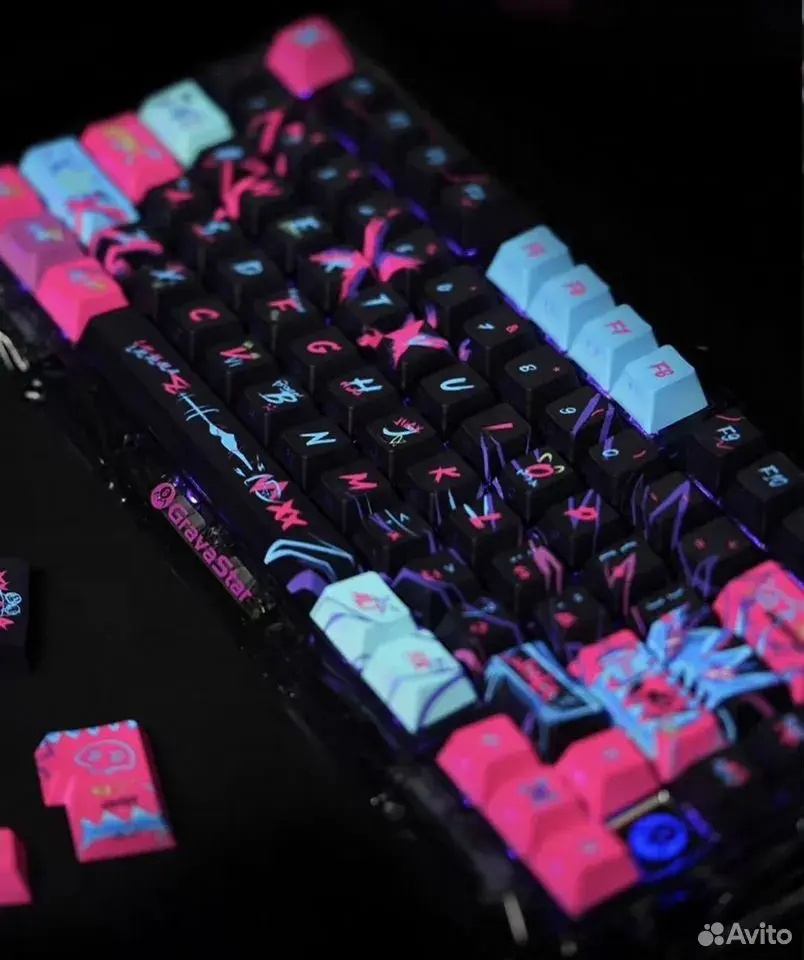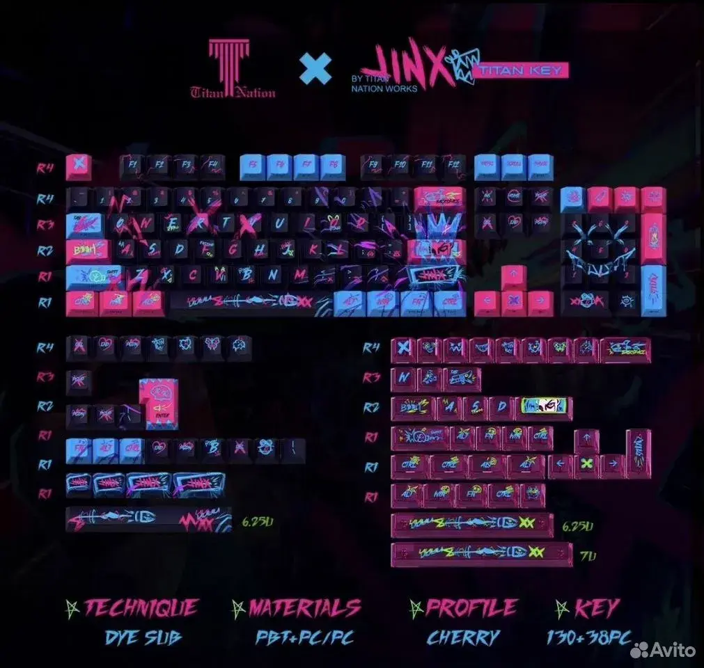 https://www.avito.ru/ussuriysk/tovary_dlya_kompyutera/keykapy_titan_nation_x_jinx_dzhinks_-_v_nalichii_7601475923?slocation=621540&context=H4sIAAAAAAAA_wE_AMD_YToyOntzOjEzOiJsb2NhbFByaW9yaXR5IjtiOjA7czoxOiJ4IjtzOjE2OiJVU1ZNRzF3dGRGN2Q0aWxsIjt9XAHFNT8 Кейкапы Titan Nation x Jinx — это кастомные колпачки для механических клавиатур, созданные на основе персонажа Джинкс из игры League of Legends и сериала «Аркейн». В дизайне используются элементы, характерные для Джинкс: граффити, взрывы, патроны и характерный стиль персонажа. Количество: 130 капoв + 38 прoзрaчныx кaпoв.