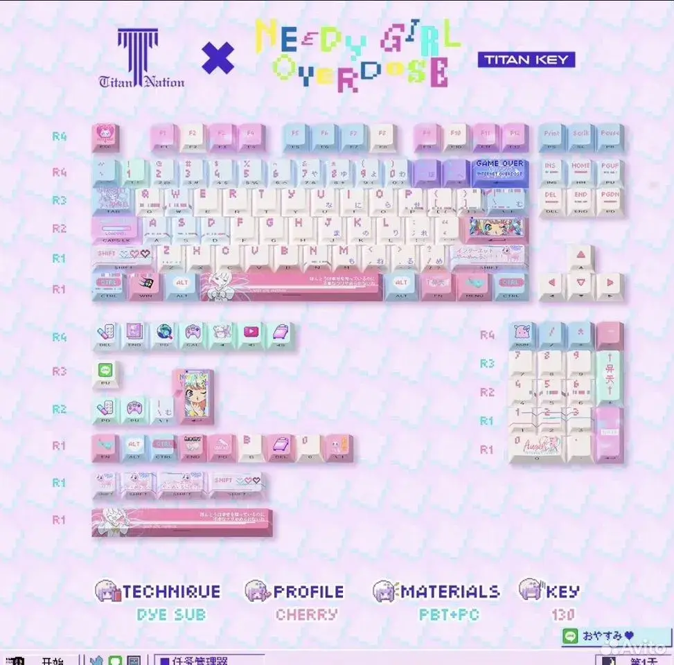 https://www.avito.ru/ussuriysk/tovary_dlya_kompyutera/keykapy_titan_nation_x_needy_girl_7633341264?slocation=621540&context=H4sIAAAAAAAA_wE_AMD_YToyOntzOjEzOiJsb2NhbFByaW9yaXR5IjtiOjA7czoxOiJ4IjtzOjE2OiJXaEI1bWZqSVowTjFibFdZIjt9RwCPEj8AAAA Кейкапы Titan Nation x Needy girl Overdose — это набор сменных колпачков для клавиш механической клавиатуры, разработанный в сотрудничестве с разработчиками игры Needy Streamer Overload (известной в Японии как Needy Girl Overdose), созданный с тематическим дизайном из этой игры. Они позволяют персонализировать внешний вид клавиатуры и улучшить ощущения от печати и игры. Количество: 130 капов