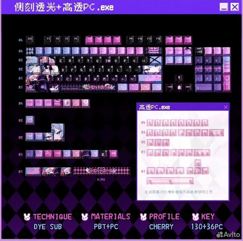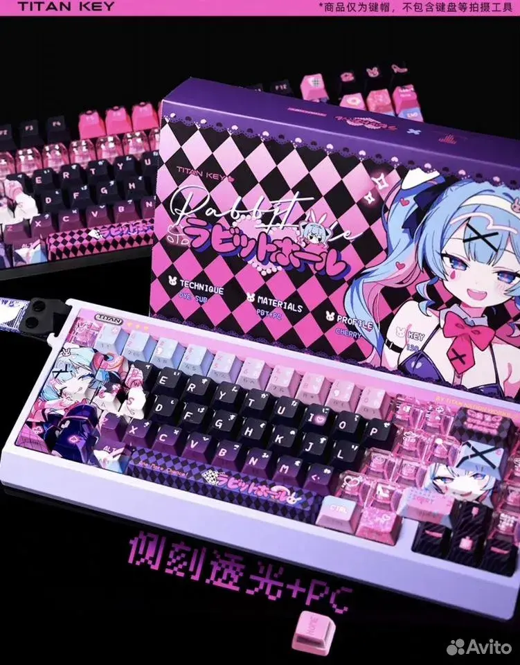 https://www.avito.ru/ussuriysk/tovary_dlya_kompyutera/keykapy_titan_nation_x_rabbit_hole_v_nalichii_7601448037?slocation=621540&context=H4sIAAAAAAAA_wE_AMD_YToyOntzOjEzOiJsb2NhbFByaW9yaXR5IjtiOjA7czoxOiJ4IjtzOjE2OiJVU1ZNRzF3dGRGN2Q0aWxsIjt9XAHFNT8AAA Кейкапы Titan Nation x Rabbit Hole — это набор кейкапов для механических клавиатур, созданный в сотрудничестве брендов Titan Nation и Rabbit Hole. Дизайн набора вдохновлен аниме и поп-культурой, включая тематику "Алисы в Стране чудес" (Rabbit Hole) и других персонажей, например, Хацунэ Мику (Hatsune Miku). Количество: 130 капoв + 36 прoзрaчных.