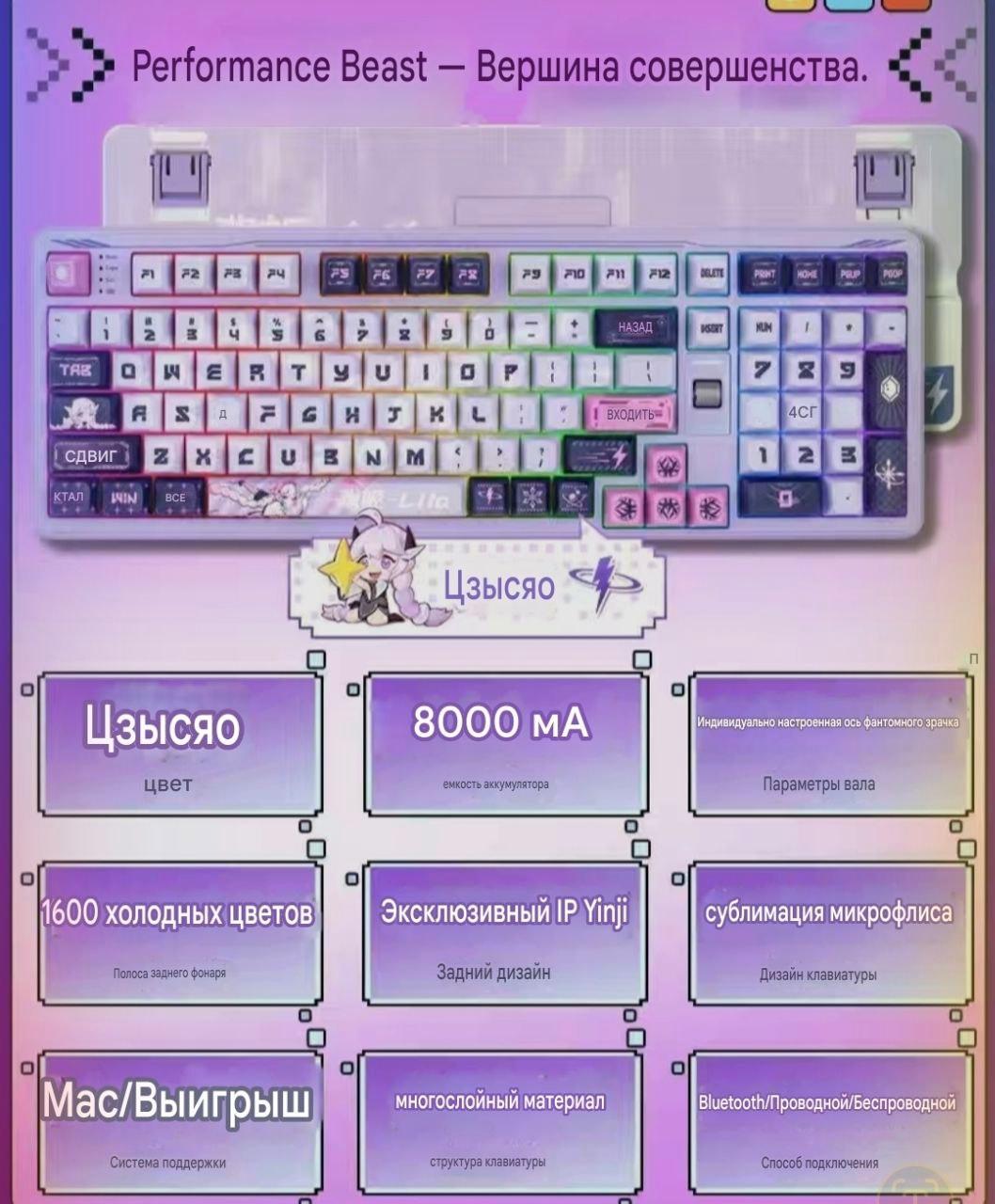▌ Игровая клавиатура Colorful 98PRO Anime Цветовая 98PRO Anime — игровая клавиатура, совмещающая технологии и аниме-дизайн. Она предназначена для геймеров, ценящих высокий уровень производительности и эстетику. ▌ Особенности: - Анимешный дизайн: яркие оттенки и узоры. - Механические переключатели: надежные и тактильные (до 50 млн нажатий). - RGB-подсветка: индивидуальная настройка эффекта подсветки. - Эргономика и комфорт: мягкая подкладка для запястий. - Макросы и профили: четыре сохраняемых профиля с настроенными макросами. - Отдельная цифровая панель: удобные мультимедийные кнопки и регулировщики громкости. - Совместимость: Windows и Mac OS X, ПО для тонкой настройки. ▌ Для кого подойдет: - Поклонники аниме, желающим отразить свои вкусы в интерьере. - Геймеры экшн-РПГ и МОБА-игр, ценящие точность и отклик. - Люди, предпочитающие персональные настройки и расширение функционала. ▌ Преимущества: - Эксклюзивный аниме-дизайн. - Механические переключатели с точной реакцией. - Многофункциональность и широкая настройка. - Наличие дополнительной цифровой панели. Отправляйтесь в увлекательное путешествие с Colorful 98PRO Anime!